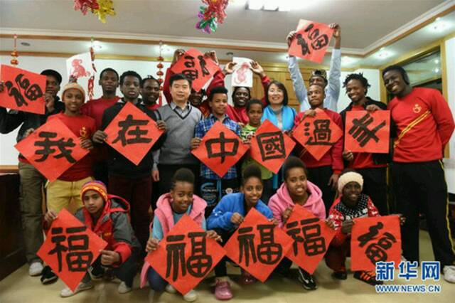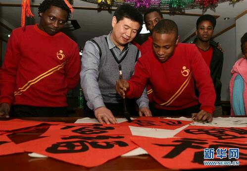 当日,在河北沧州吴桥杂技艺术学校学习杂技的20多名非洲留学生与沧州艺术家欢聚一堂,留学生在艺术家的指导下学写春联、“福”字,感受中国春节的喜庆“年味”。