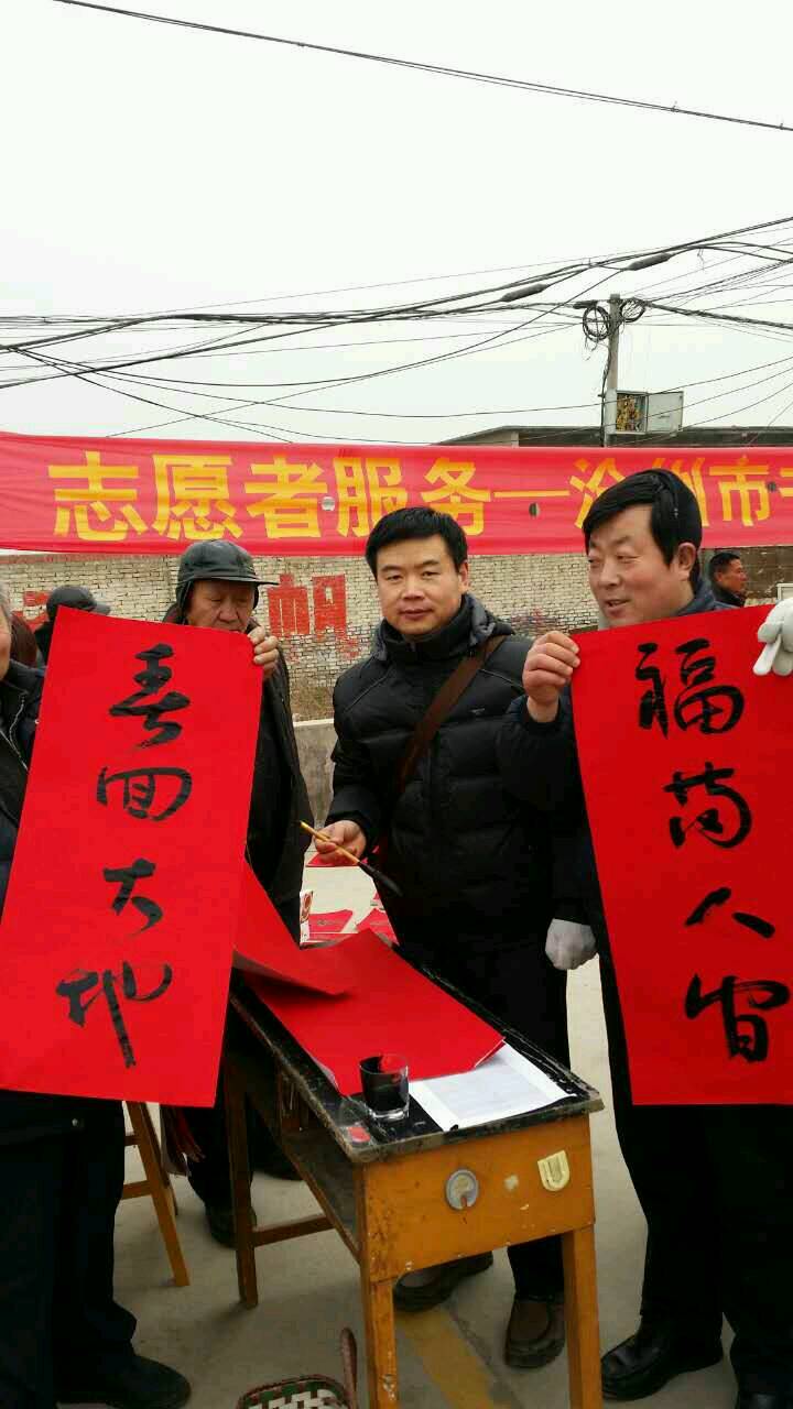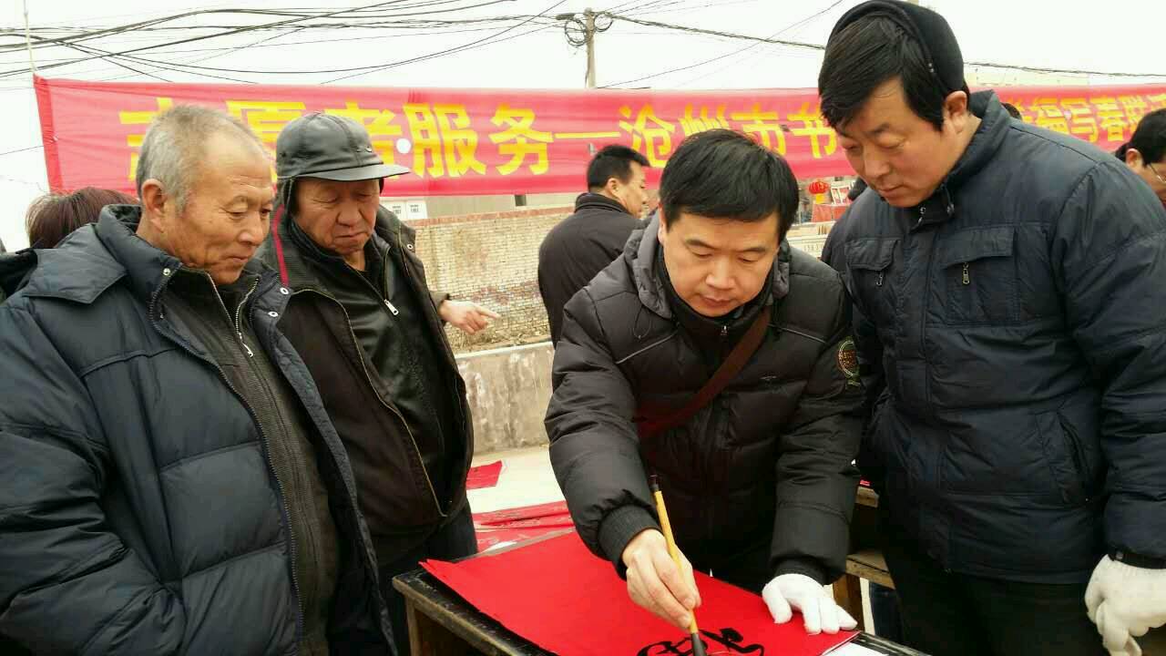 2016年1月31日,民革党员王旭初参加沧州市书协下基层送福写春联活动,来到沧县风化店大集上为百姓现场书写春联福字,受到当地群众的热烈欢迎!